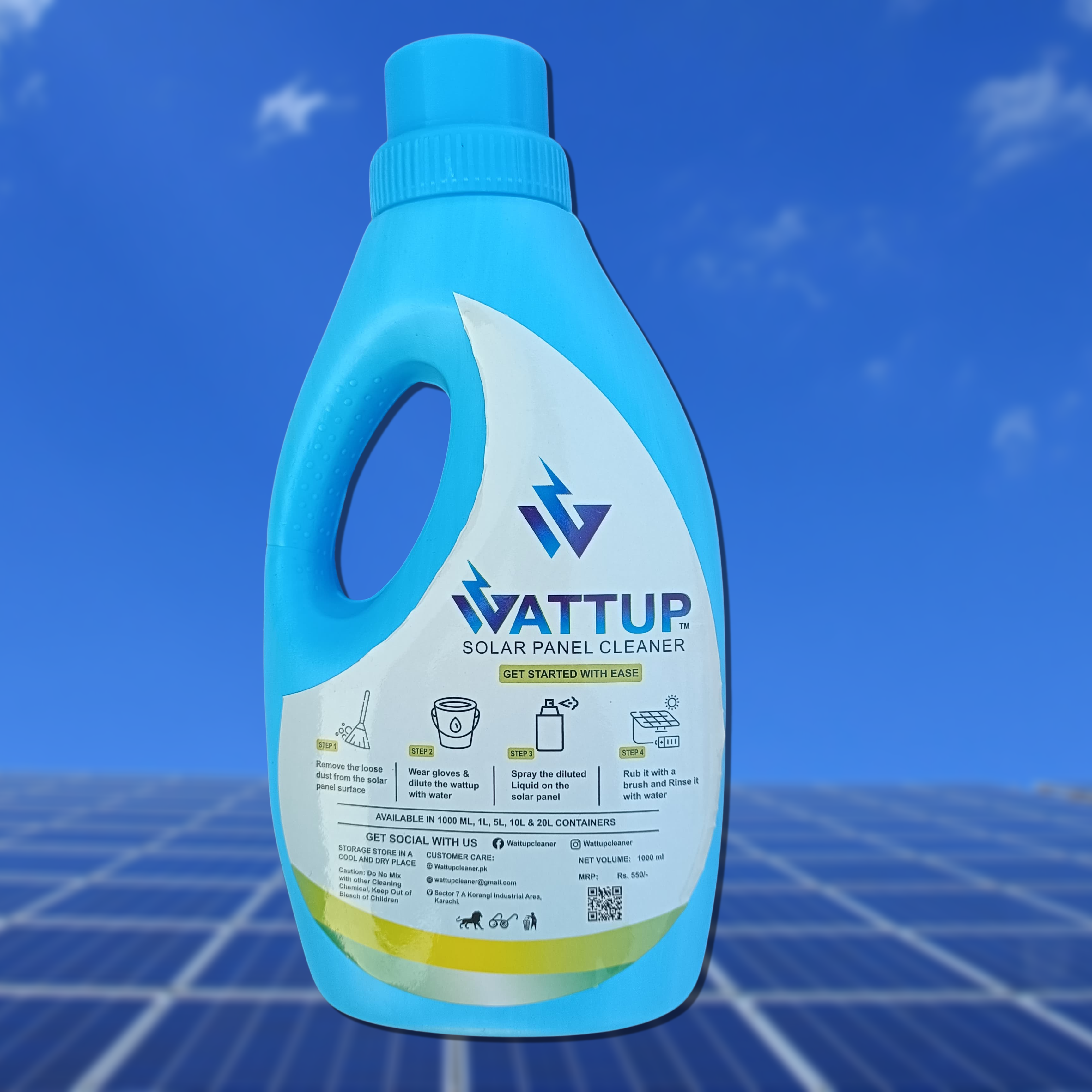 Boost the performance of your solar panels with our wattup Solar Panel Cleaner Pakistan, our wattup cleaner ensure that panel stay clean and produce maximum energy output. Our solar panel cleaner formula removes dirt, dust, and stains without damaging your panels when used with soft brushes. Power up your solar system for a cleaner, greener, and more sustainable future.